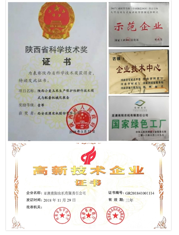 亞澳農機堅持“產(chǎn)品就是人品、內在是我心、外在是我臉”的品質(zhì)原則,多功能變速旋耕機、旋播施肥機、聯(lián)合耕整機、雙軸滅茬機、精量免耕播種機、深松機等產(chǎn)品在耕整機械(主機配套40-300馬力)領(lǐng)域處于行業(yè)前列, 累計取得自主專(zhuān)利78項。2018年“亞澳”商標獲得中國馳名商標,產(chǎn)品多次被中國農機化協(xié)會(huì )、中國農業(yè)機械流通協(xié)會(huì )、中國農業(yè)機械工業(yè)協(xié)會(huì )授予“AAA級信用企業(yè)”、“技術(shù)進(jìn)步獎”、“產(chǎn)品創(chuàng )新獎”、“全國農機用戶(hù)滿(mǎn)意品牌”、“最具影響力品牌”,被國家相關(guān)部委單位授予農業(yè)部科技進(jìn)步三等獎、星火計劃金獎、西安市科技進(jìn)步一等獎、陜西省行業(yè)之星企業(yè),“專(zhuān)精特新”中小企業(yè),南陽(yáng)市級科技百強企業(yè)等多項殊榮;國家型高新技術(shù)企業(yè),在農機行業(yè)中具有較高的美譽(yù)和知名度,得到了社會(huì )的廣泛認可。